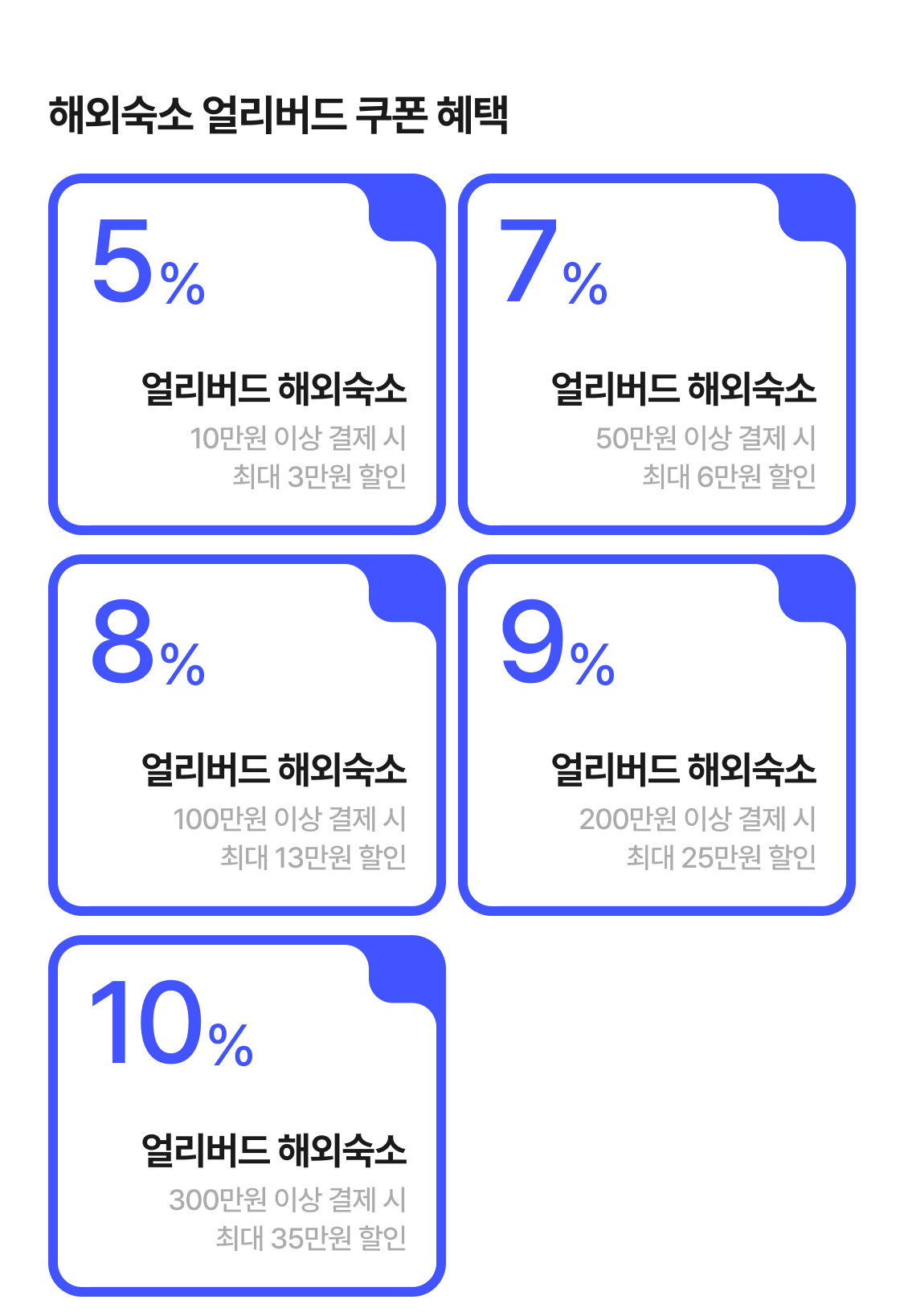 | 해외숙소 10% 할인쿠폰 | 10% 할인(최대 350,000원) | ∘ 상품 판매가 300만원 이상 결제시 적용∘ 발급 당일 23:59분까지 사용가능 |