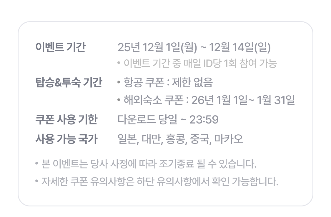 | [12월의쿠폰] 동남아 투어·티켓 10% 할인 | 동남아 지역 상품 10% 할인 |