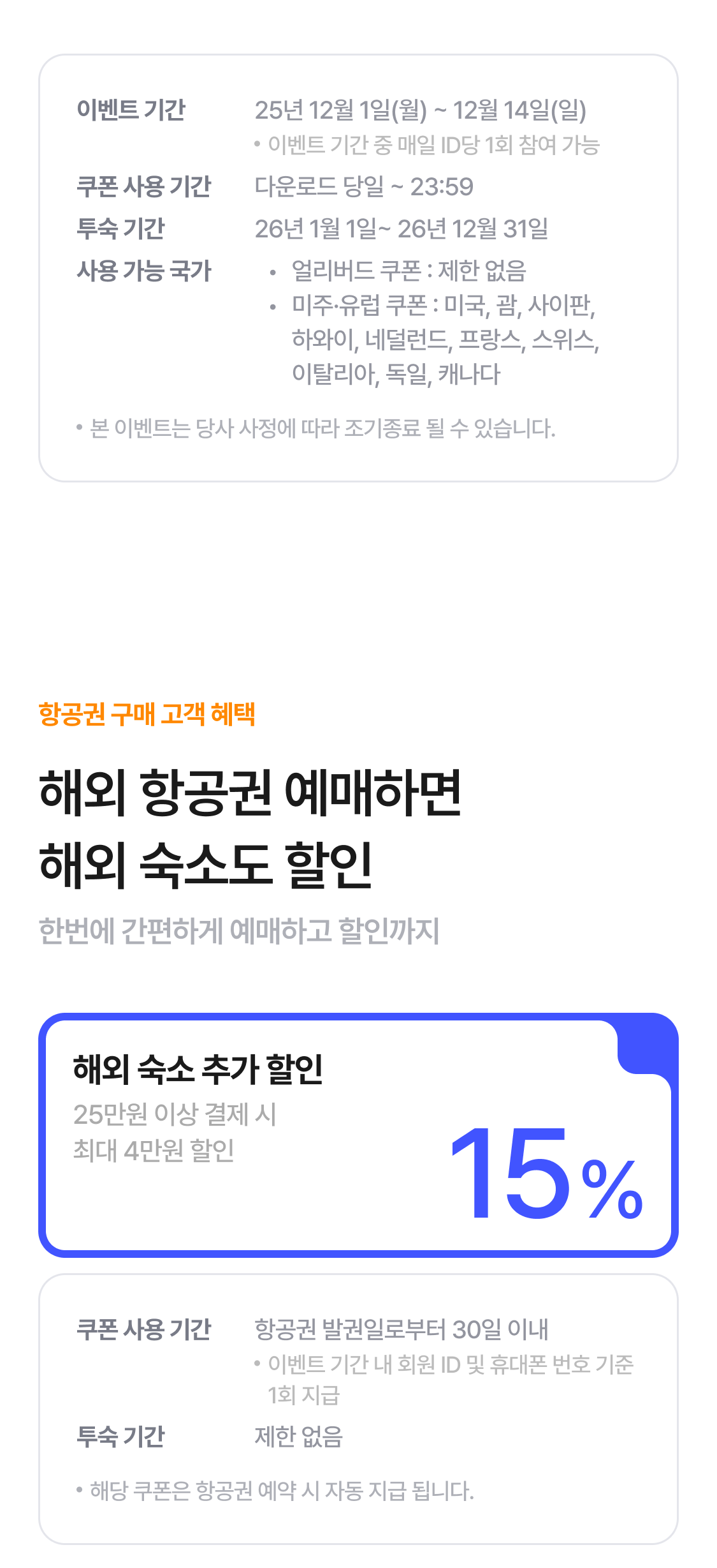 | 국제선 구매 고객 해외숙소 할인 쿠폰 | 15% 할인 (최대 4만원) |