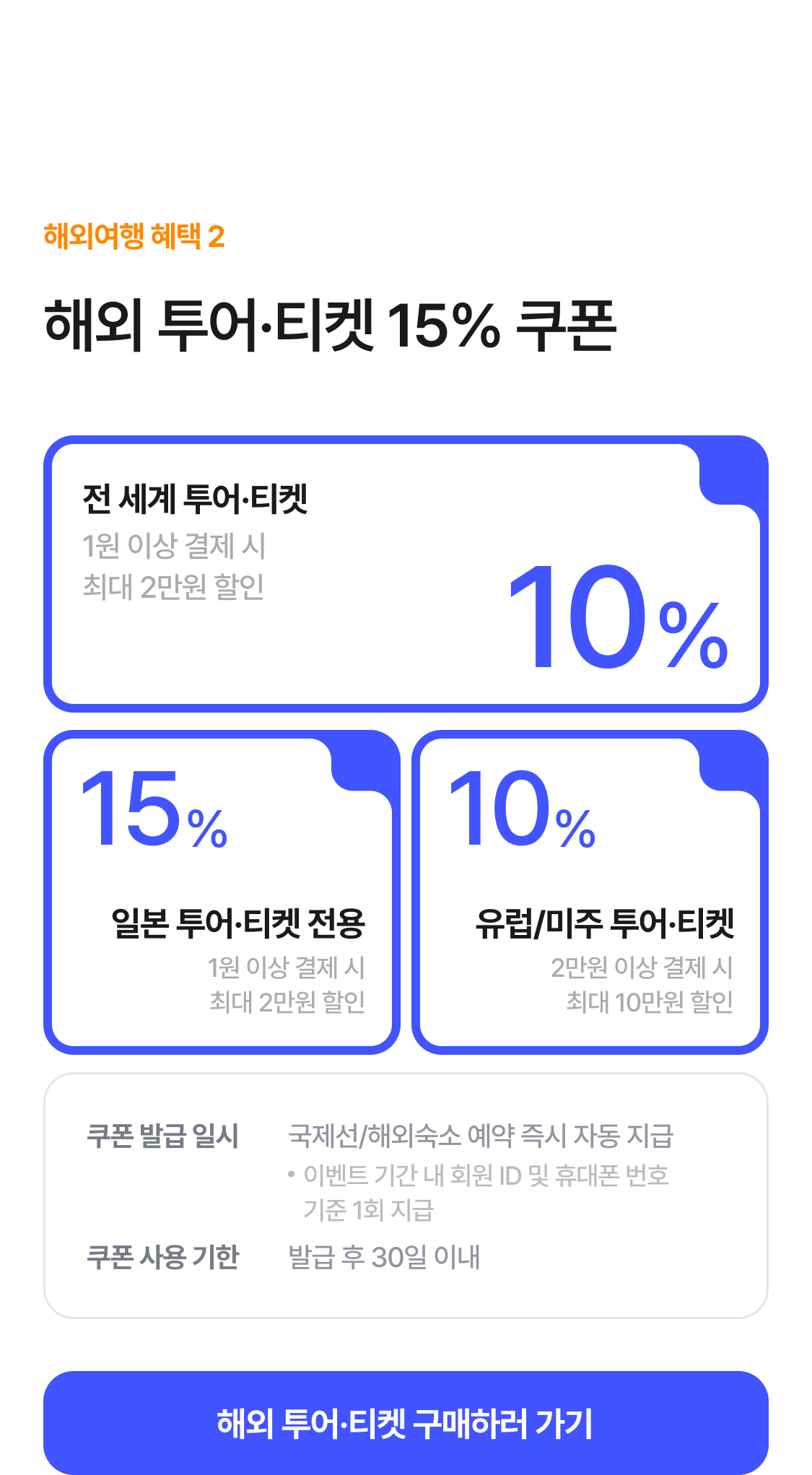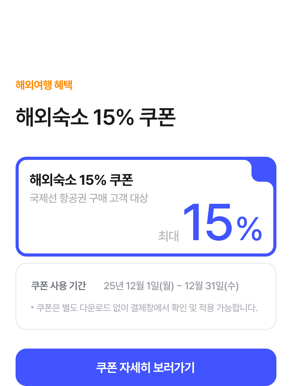 - 다운로드 받은 쿠폰은 '마이페이지 > 쿠폰함 > 해외숙소에서 확인 가능하며,