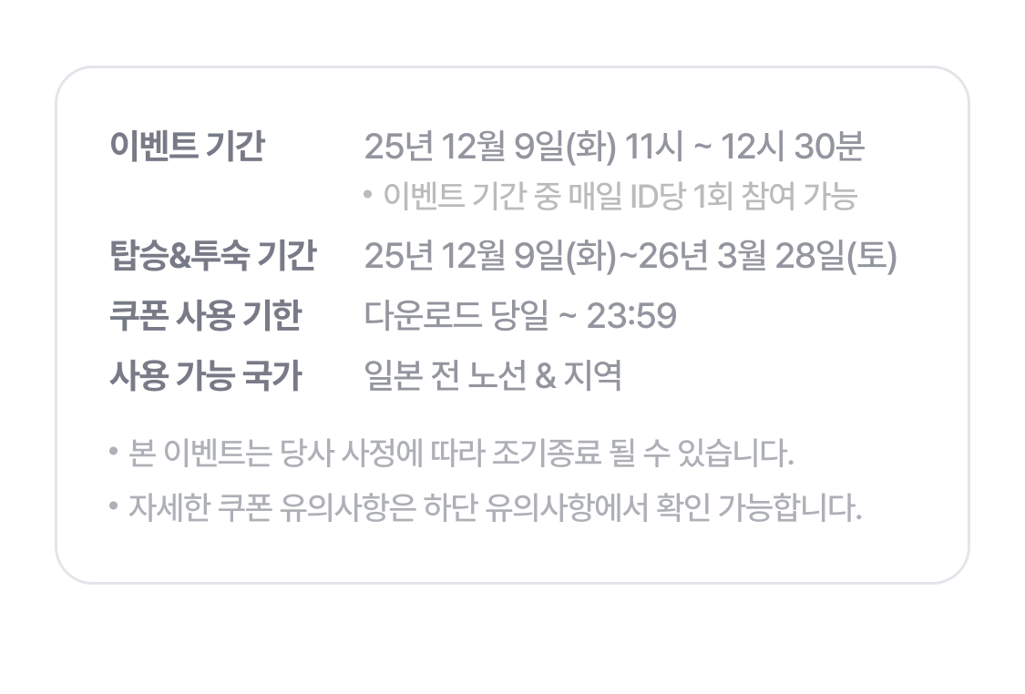 - 이벤트 기간 : 2025년 12월 9일 (화) 오전 11시 - 12시 30분 (NOL 라이브 시간 한정 발급)