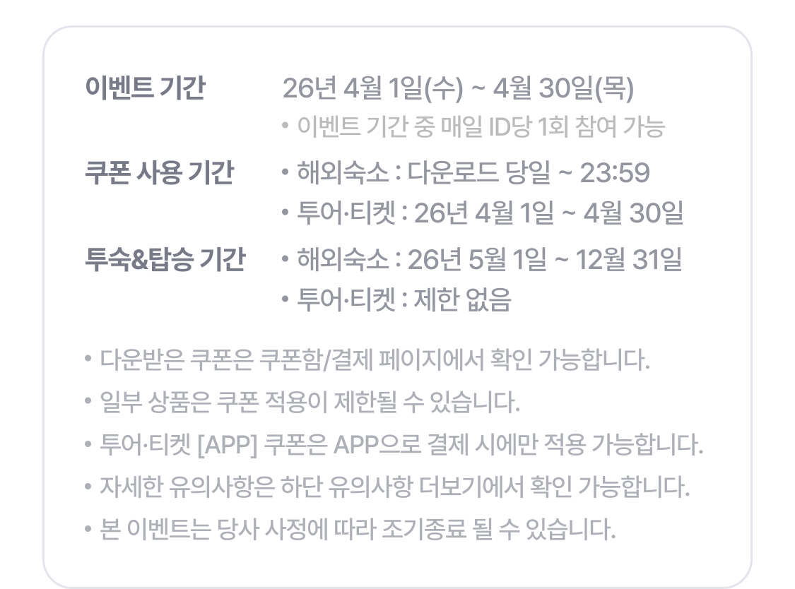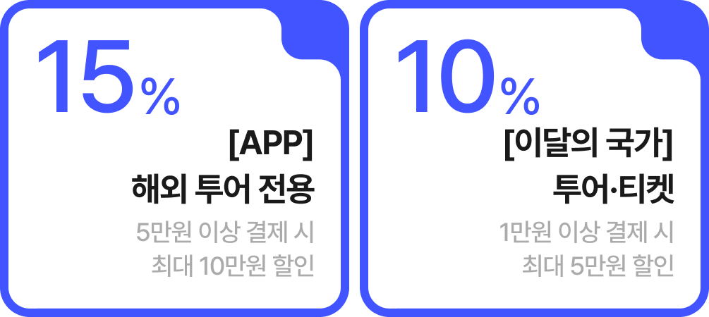 | [4월 APP전용] 해외 투어 전용 15% 할인 | 최대 10만원 할인 |