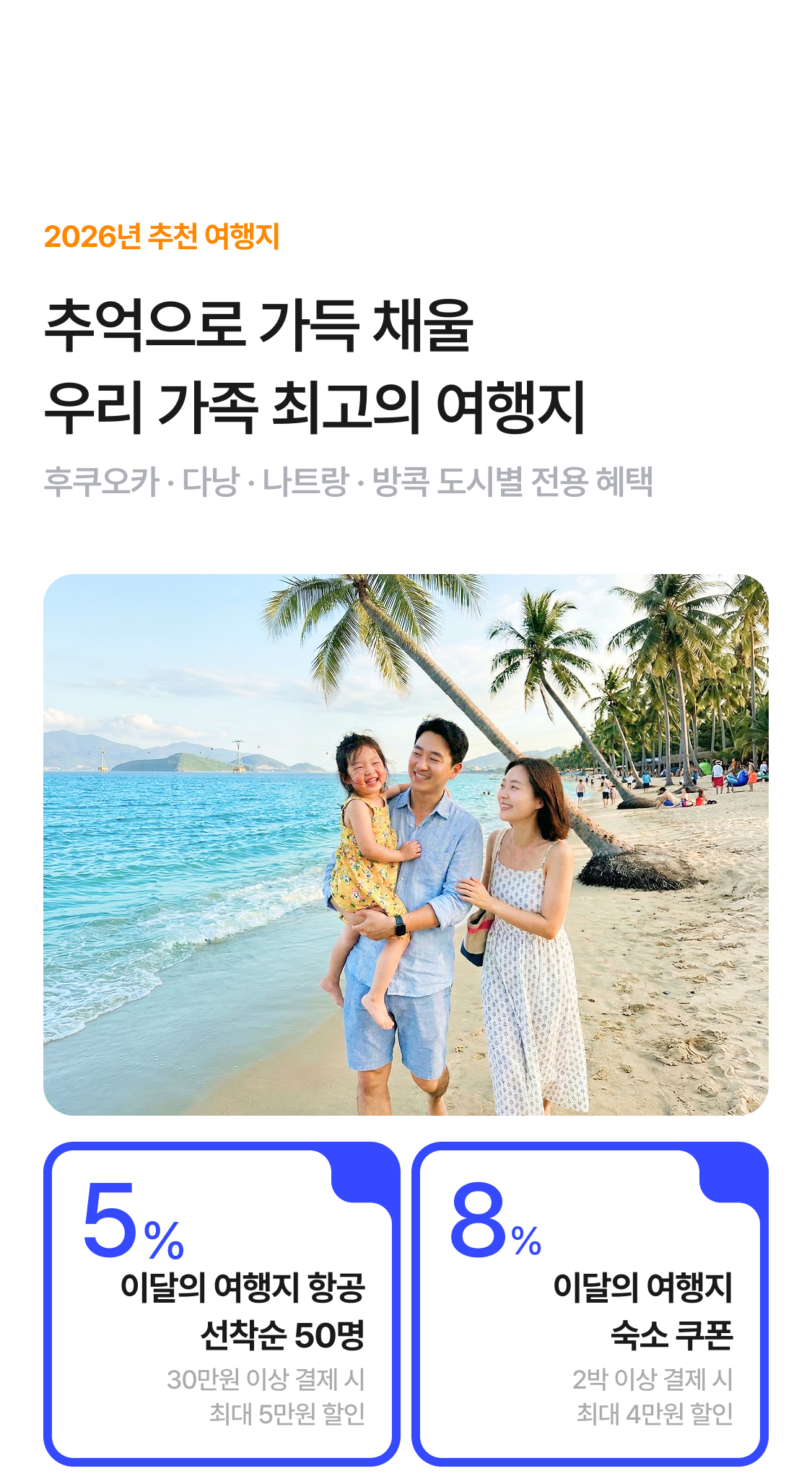 | 항공 선착순 장거리 5% 할인쿠폰 | 최대 8만원 할인 |