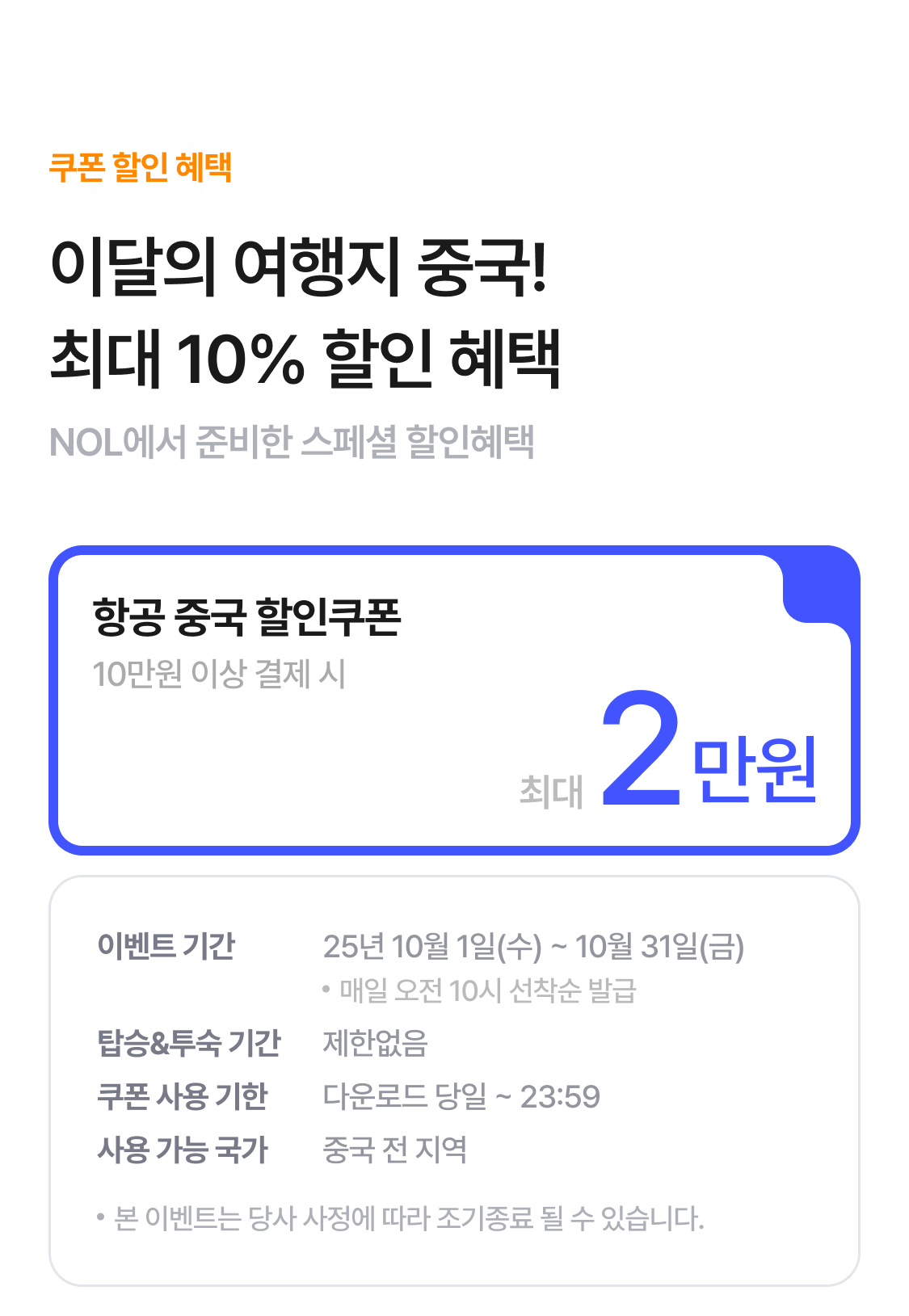 적용 카테고리/상품 : 국제선 (중국 노선)