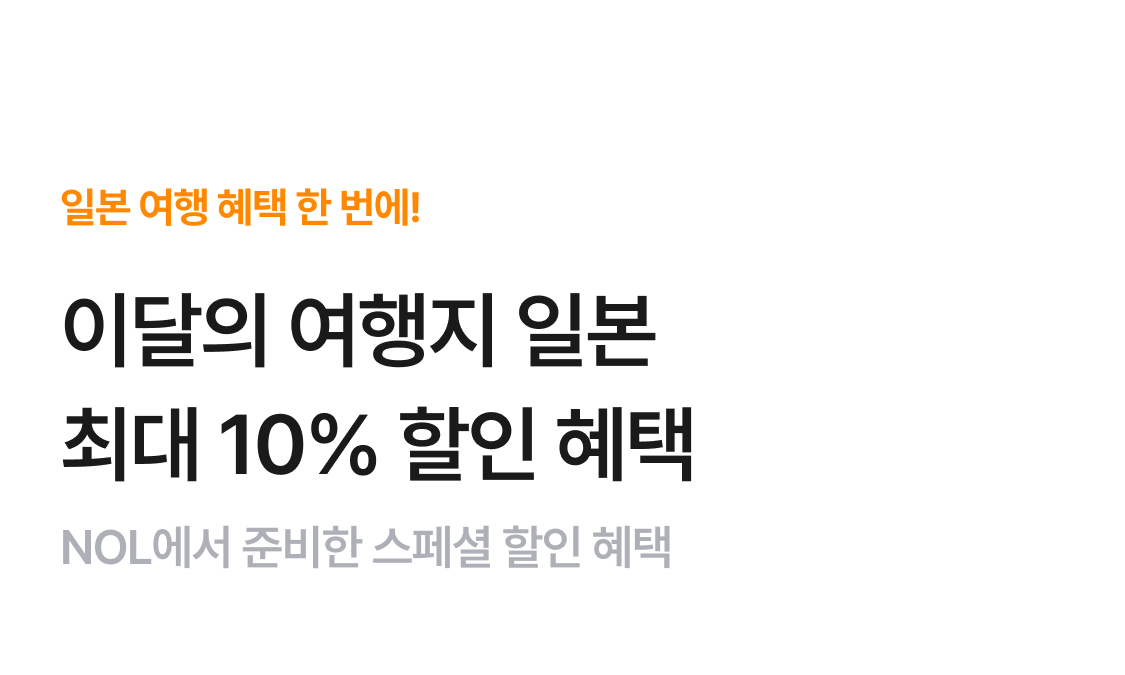 - 할인 : NOL 앱/웹에 표기되어 있는 상품 판매가에서 발권 수수료 1만원을 차감 제외한 금액 기준으로 할인 적용되는 쿠폰으로, 본 쿠폰은 각 쿠폰별로 이벤트 기간 중 1회 사용 가능합니다. (예약 1건당 1개의 쿠폰 사용 가능)