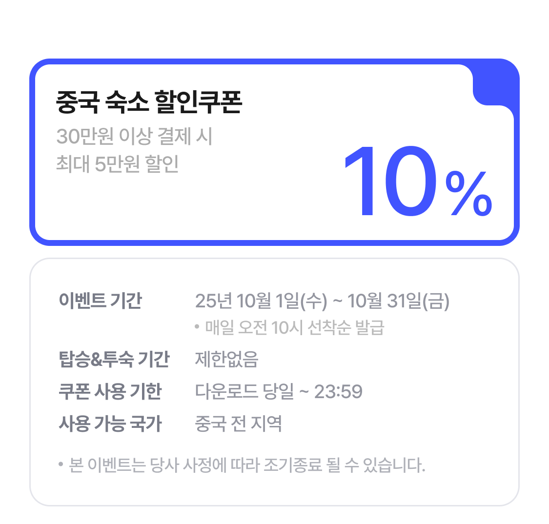 ∘ 탑승기한 제한없음∘ 상품 판매가 10만원 이상 결제시 적용∘ 매일 오전 10시, 선착순 1,000명 발급