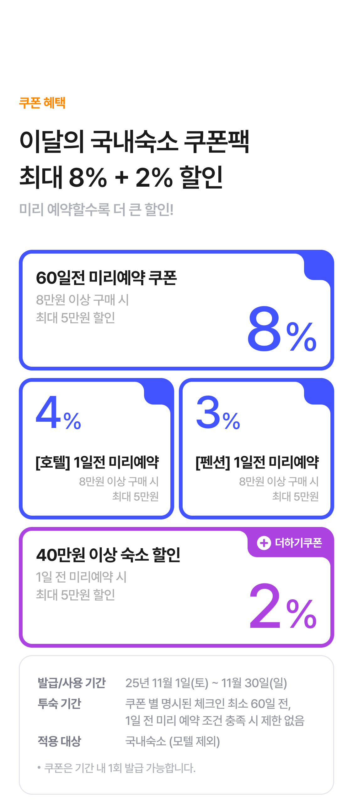 | 40만원 이상 숙소 2% 더하기 쿠폰 | 2% (최대 5만원) | - 쿠폰 사용기간 내 상품 판매가¹⁾ 40만원 이상