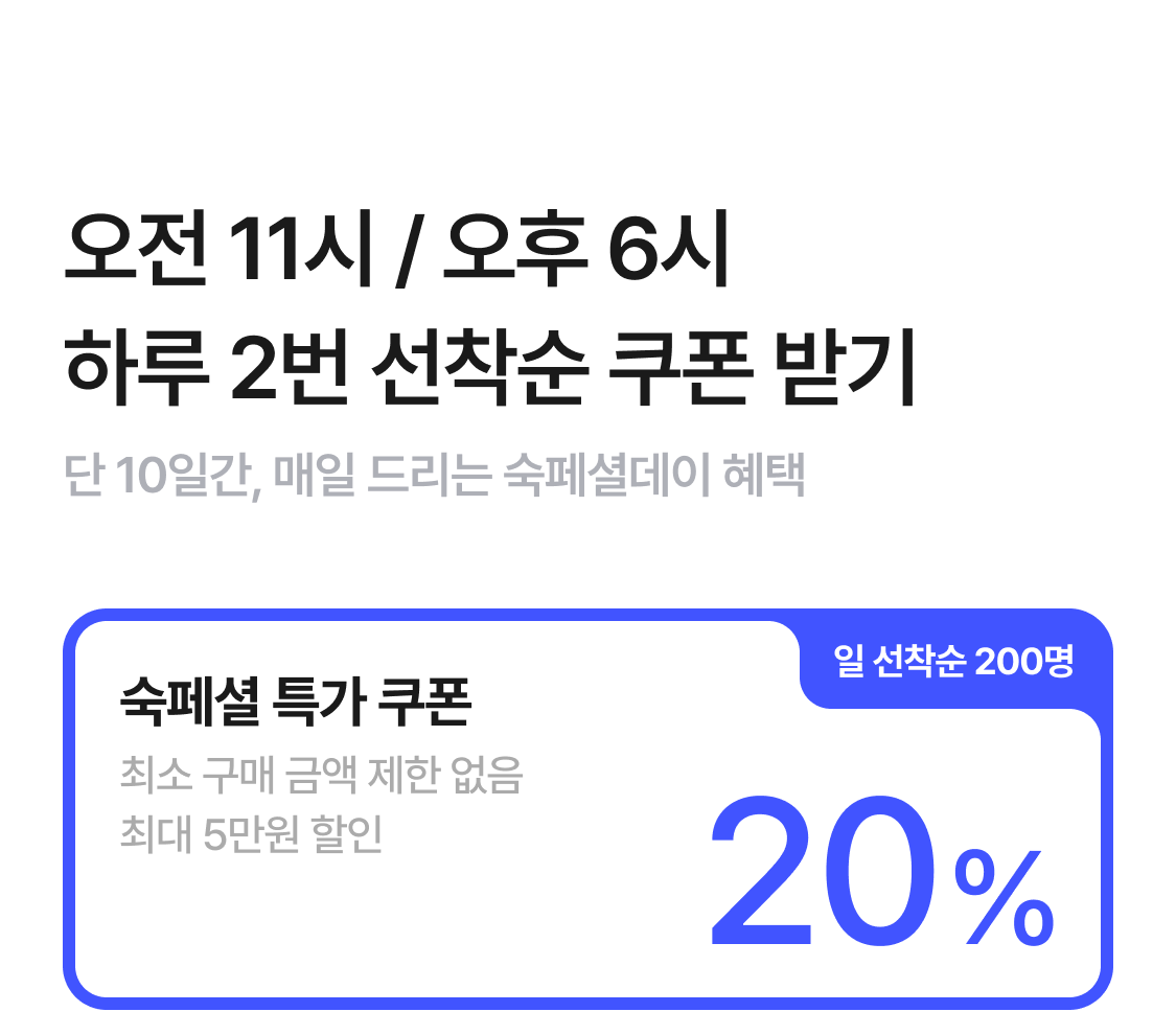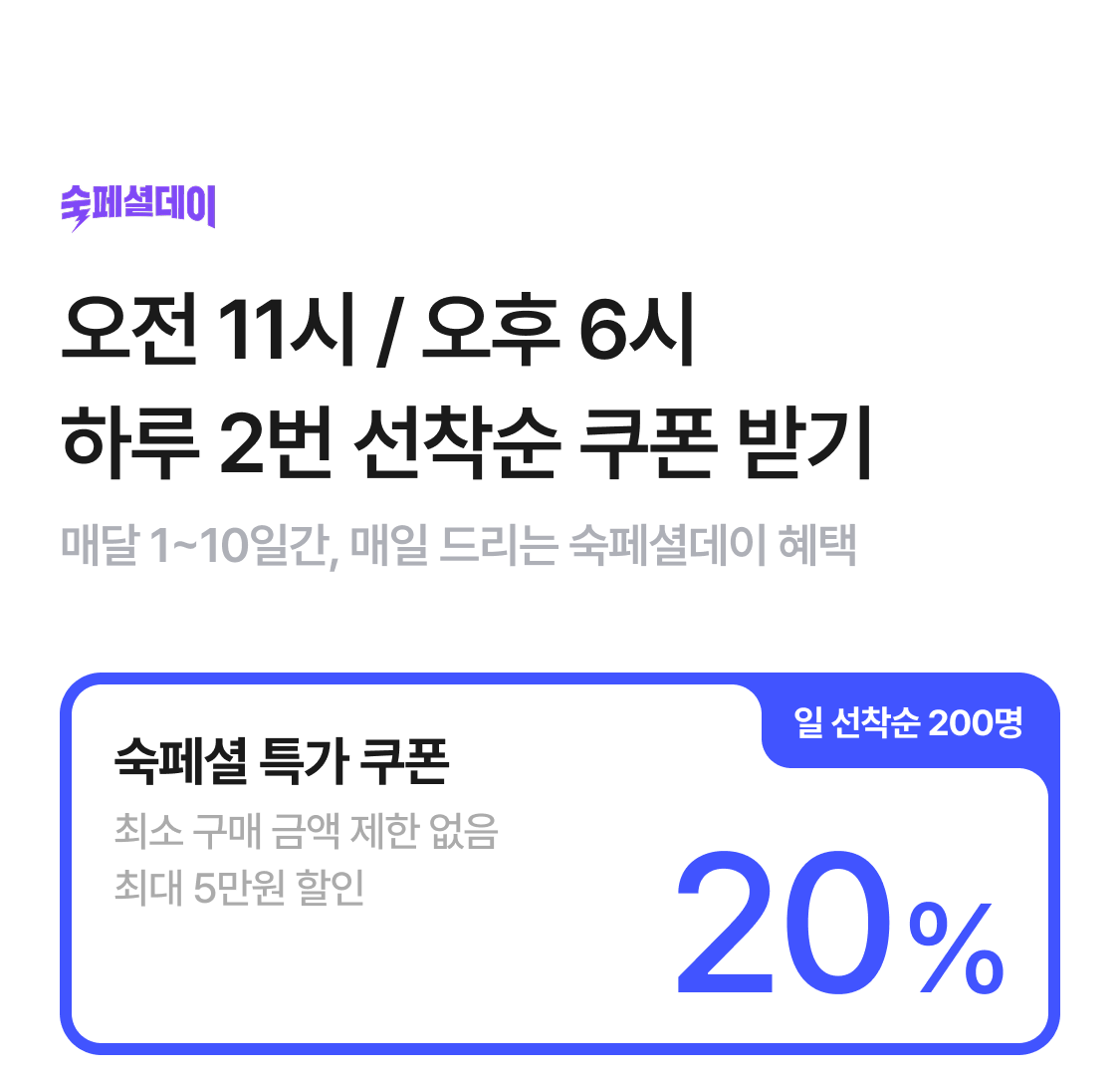 | 숙페셜특가 20% 쿠폰 | 20% (최대 5만원) | - 쿠폰 사용기간 내 상품 판매가 1) 제한 없음