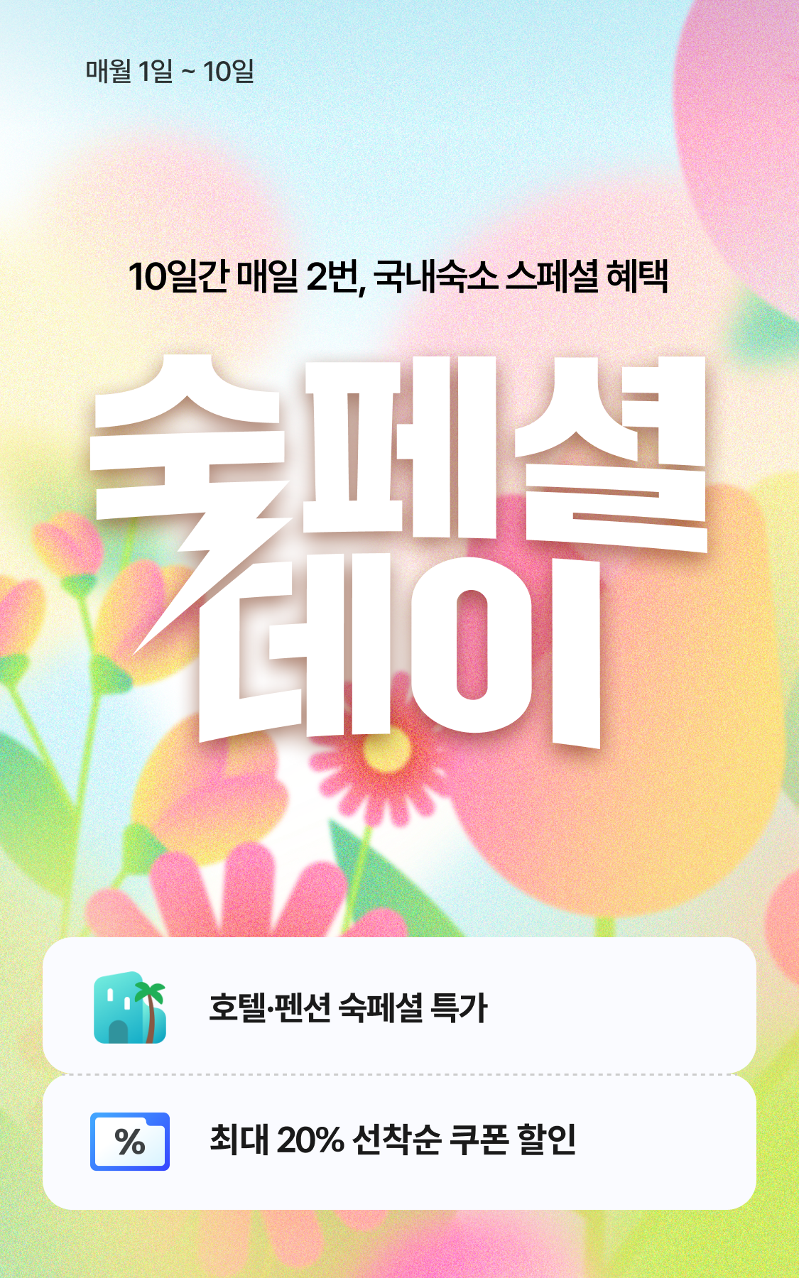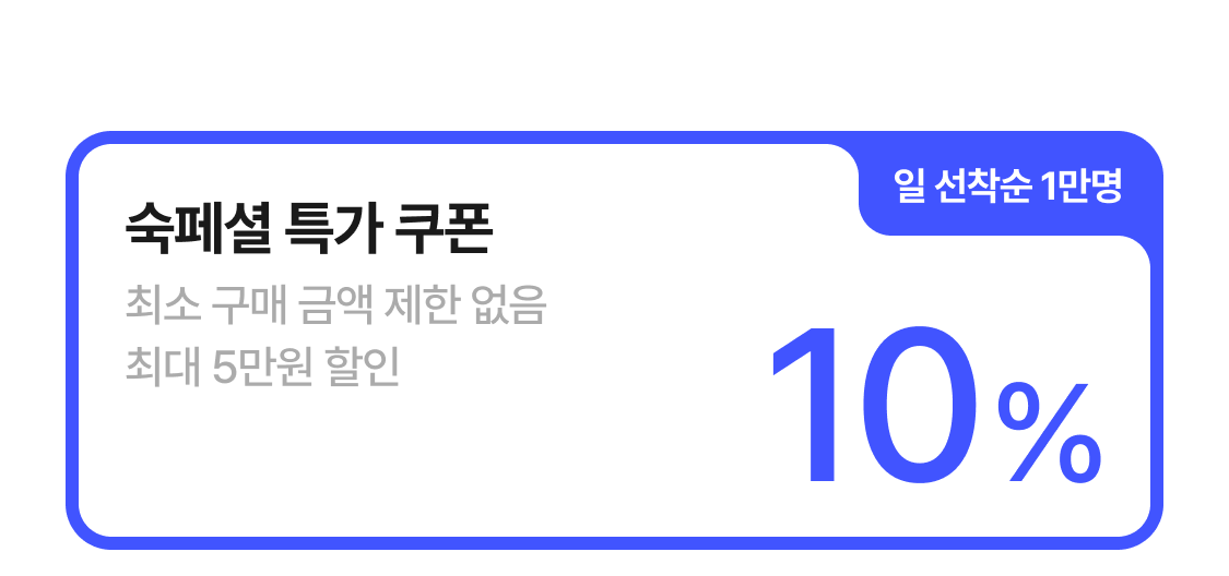 | 숙페셜특가 10% 쿠폰 | 10% (최대 5만원) | - 쿠폰 사용기간 내 상품 판매가 1) 제한 없음