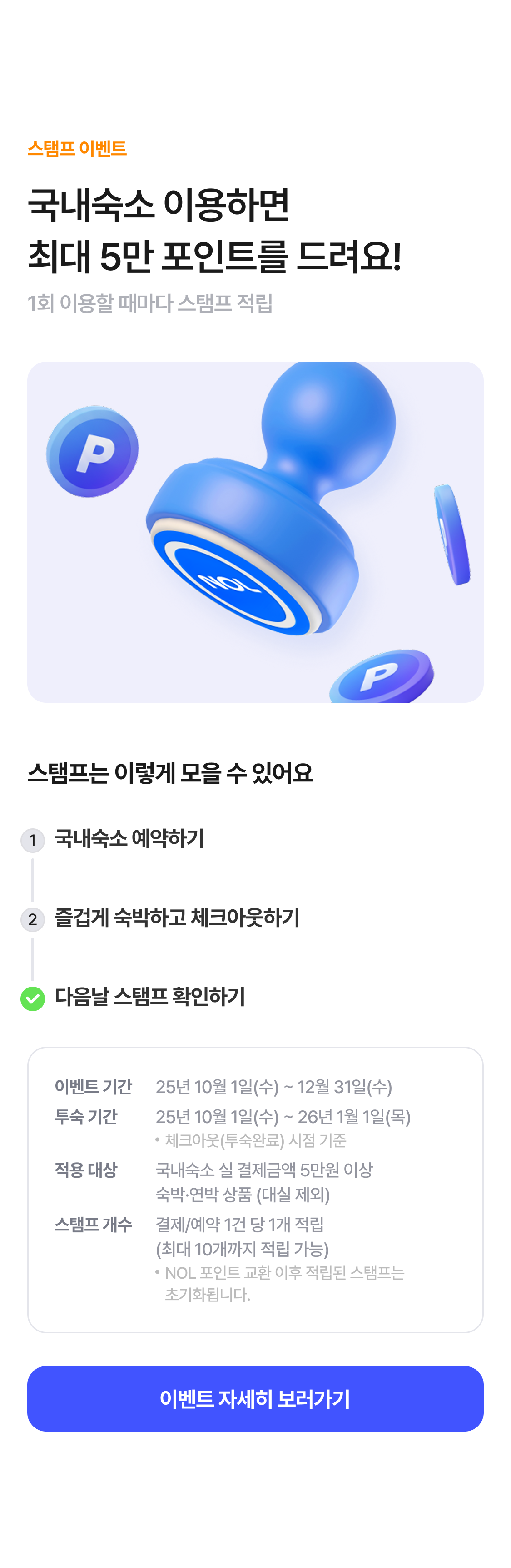 - 1) 상품 판매가 : NOL 앱/웹에 표기되어 있는 상품 판매가. 이벤트 적용 대상 숙소의 예약 1건 기준 상품 판매 금액 (한 번의 결제로 연박 시, 1건의 예약으로 인정)